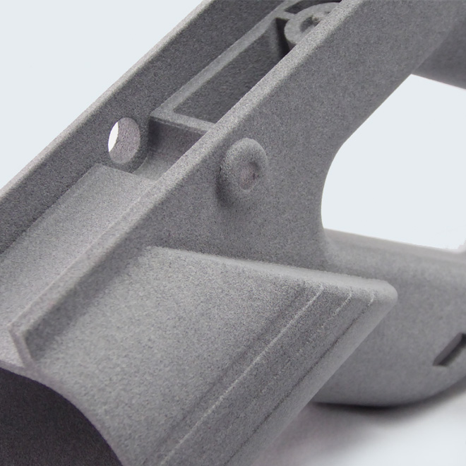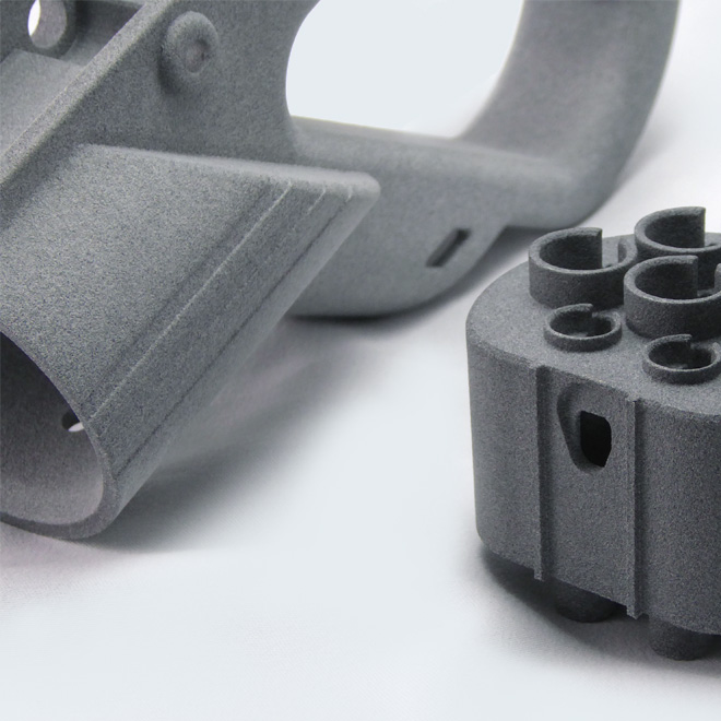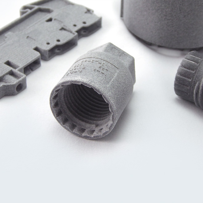 Graue Bauteile: Standardmäßig sind Bauteile, die im Multi Jet Fusion Verfahren gefertigt werden, in der Grundfarbe grau. Es können nachträgliche Färbeverfahren angewendet werden, um die Oberfläche zu veredeln. Die Farben sind dabei jedoch nicht kräftig leuchtend und können einen leicht gedämpften Eindruck machen. Außerdem ist die Farbauswahl eingeschränkt, sehr helle und knallige Farben sind nicht möglich. Besonders gut lassen sich die Bauteile schwarz einfärben.